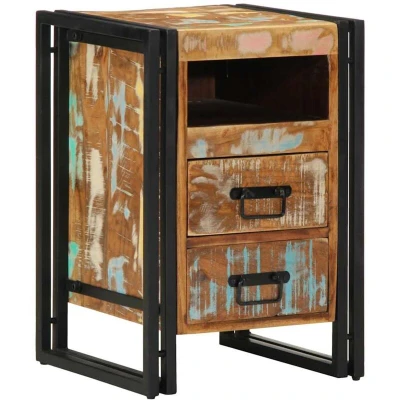 ManoManoGeneral description This wooden bedside cabinet with an elegant design makes a timeless addition to your interior decor. It is crafted from solid reclaimed wood, which consists of reused timbers such as teak, mango wood, pinewood, and beech. These materials are recycled from old buildings like factories, sheds, and boats. Each piece features signs of wear and a visible grain structure, giving it a unique look and history. Technical specifications Material: Solid reclaimed wood, iron Dimensions: 40 x 40 x 59 cm (L x W x H) Includes: 1 shelf and 2 drawers Assembly required: Yes SKU: 4016698 Usage Ample storage space for magazines, books, glasses, and other bedtime essentials, keeping them organized and within reach. The sturdy top is perfect for placing table lamps, alarm clocks, books, picture frames, small potted plants, decorations, or other essentials. The practical handle provides a comfortable grip for easy opening and closing of the cabinet. Other information Warning: To prevent