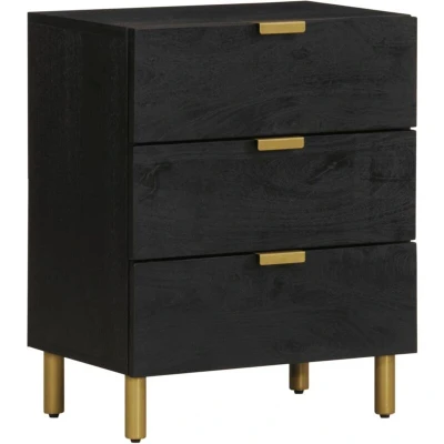 General description This trendy bedside cabinet, featuring a sleek and classic design, is meant to upgrade your interior to the next level. Made of high-quality engineered wood, it offers a smooth surface along with strength, stability, and moisture resistance. The bedside table is easy to clean with a damp cloth. Technical specifications Colour: Black Material: Engineered wood, solid mango wood, brass Overall dimensions: 50 x 33 x 62 cm (L x W x H) Feet height: 10 cm Assembly required: Yes Compatibility and accessories 3 drawers for ample storage space to keep magazines, books, remote controls, and other small items organized. Sturdy top ideal for displaying decorative objects, photo frames, and potted plants. Installation To prevent tipping, this product must be used with the provided wall attachment device. Other information