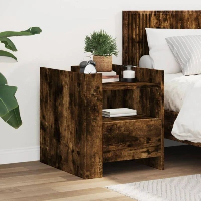 General description This bedside cabinet in smoked oak features a stylish design that seamlessly fits into your bedroom or living room, adding a timeless charm to your interior. It is constructed from high-quality engineered wood, ensuring durability and a smooth surface. Technical specifications Colour: Smoked oak Material: Engineered wood Dimensions: 45 x 50 x 50 cm (L x W x H) Maximum load capacity (total): 50 kg Maximum load capacity (drawer): 5 kg Maximum load capacity (laminate): 30 kg Assembly required: Yes Installation The bedside cabinet can be assembled in two ways: you can install the two corner panels on the same side or on opposite sides, positioning the baffle plates at the front or one at the front and the other at the back. Usage Ample storage space with a convenient drawer for keeping essentials close at hand. Stable and sturdy tabletop, ideal for displaying decorative items, picture frames, and potted plants. Moisture-resistant and easy to clean, ensuring it