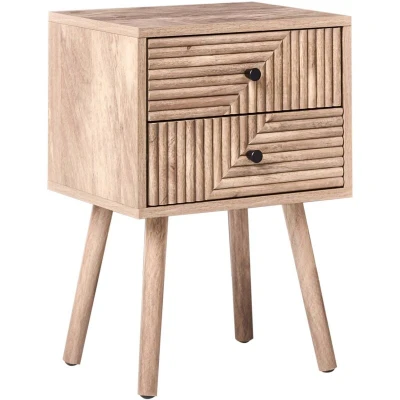 Nightstand in a Modern Style. Bring warmth and understated elegance to your bedroom with this beautifully designed nightstand. Crafted from durable MDF and supported by solid pine wood legs, it offers a perfect balance of strength, stability and natural charm. The refined, textured finish adds subtle character, making it a timeless addition to both modern and classic interiors. Featuring two capacious drawers, this nightstand provides generous storage, helping to keep your space calm and organised. Thoughtfully proportioned and stylishly finished, it works effortlessly as a bedside table while also serving as an attractive accent piece within the room. Details: Product Type: Bedside Table Style: Mediterranean General Color: Brown Shade: Light Brown Material Type: Engineered Wood Main Material: MDF Additional Material: Iron Legs material: Wood Drawers: Yes Finish: Laminated Number of Drawers: 2 Shelves: No Dimensions: Depth: 30 cm Width: 38 cm Height: 55 cm Weight: 8 kg Drawer Weight