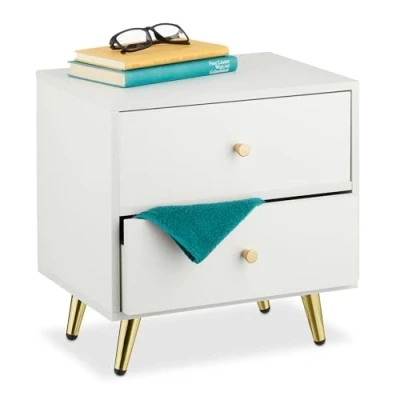 AmazonUse: Nightstand for storage next to the bed - Practical shelf for the bedroom or guest room Storage space: Bedside table with 2 drawers – for discreet storage of personal items Practical: Bedside table for lamps, books, alarm clocks, picture frames and more essentials Design: Nightstand in white with legs and handles in gold - Stylish focal point Details: Square nightstand made of MDF with iron handles - H x W x D: approx. 41.5 x 40 x 32.5 cm