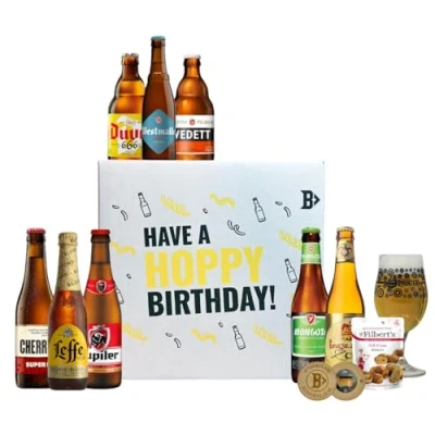 Beer HunterImpress your beer-loving friends with the best gift for a special birthday - our Hoppy Birthday Gift Box with Glass from Belgium! This carefully chosen selection of premium, traditional Belgian beers is sure to please even the most discerning palates. With offerings from top breweries like Westmalle, De Koninck, St Bernardus, Haactht, Leffe, Jupiler, Vedett, Brugse Zot, your friends will experience the true essence of Belgian beer. And don't forget the option to add a gift message to make their birthday celebration even more memorable.