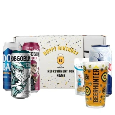 Beer HunterCelebrate their special day with the world's best beer using this Personalised British Ale Birthday Craft Beer Gift Set - (4 x 330ml). Featuring three renowned breweries - Doom Bar, Wychwood Hobgoblin, and Shipyard - and a Beerhunter Pint Glass, this set is the perfect gift for any beer enthusiast.