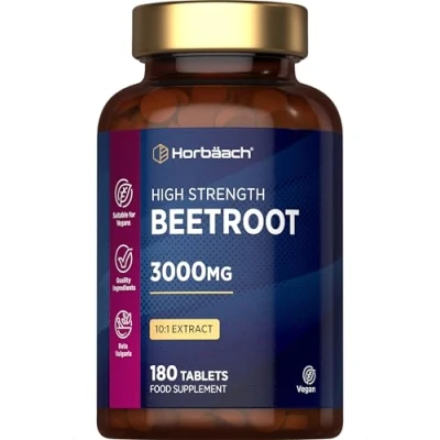 HIGH STRENGTH: Support your wellbeing with 3000mg Beetroot per daily dosage from a 10:1 Root Extract. RICH NUTRIENTS: Beetroot is naturally rich in vitamins and minerals, providing all-round support. LONG-LASTING SUPORT: Enjoy 3 months of uninterrupted support with 180 tablets per bottle - no hassle, no frequent reordering, just a simple addition to your daily routine. SUITABLE FOR: Horbaach Beetroot tablets are suitable for vegans and vegetarians, providing the perfect formula for adult men & women. PACKAGING MAY VARY: We are in the process of updating our packaging. If the product you receive appears different, please rest assured that the benefits remain the same.