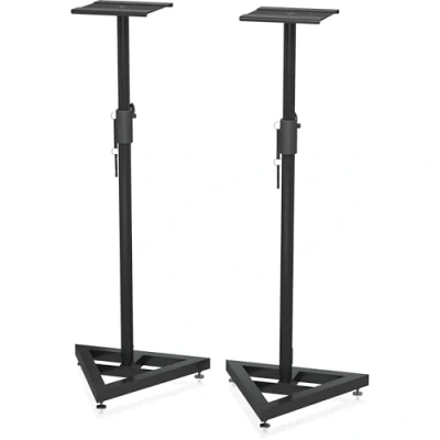 Universal triangular base stand for studio near field monitors and wide range of loudspeakers Perfect for recording studios and listening environments Large 10" x 10" (25 cm x 25 cm) metal platform with soft rubberized padding reduces vibration Precise height adjustment in 5 steps from 3 ft (0.93 m) up to 3.8 ft (1.15 m) of elevation Heavy-duty steel construction for maximum weight capacity of 55 lbs (45 kg)