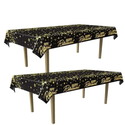 METALLIC ELEGANCE: Set of two tablecovers featuring an exquisite design with metallic gold and silver accents on a sleek black background GREAT SIZE: Each plastic rectangular tablecover measures 54 inches long by 108 inches wide, providing ample coverage for standard size tables and surfaces CHIC RETIREMENT PARTY SUPPLIES: Adorned with a metallic gold "Happy Retirement" border, these tablecovers add a touch of celebration to your retirement event OFFICE RETIREMENT PARTY: A great way to honor a co-worker’s momentous occasion in style - use these wonderful plastic table covers to adorn the tables at the Retirement Party CELEBRATE WITH US: Since 1900 The Beistle Company’s mission has remained the same: to help people around the world celebrate life’s events by creating fun, high quality products using the finest materials