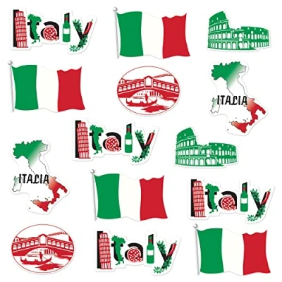 Made in the USA Includes 14 Italian Cut Outs in the package - Assorted Designs - You will receive 2 of each design These Italy Decorations range in size from 12 inches to 16 inches Printed on both sides of durable cardstock paper - You will get an assortment of great looking designs Tape to walls or windows to decorate for an Italian themed party