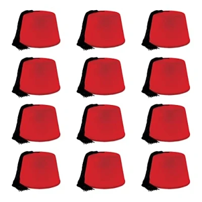 This item is a great value! Includes 12 felt fez hats in package One size fits most Red felt with black tassels Wear for an International, British or Halloween party!