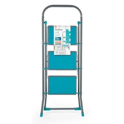 Beldray LA024510TQ 3 Step Ladder Non Slip Folding Ladder, Approx 2.5m Reach Height, Wide Steps, Carry Handle, Strong Steel With Safety Clip, Compact Storage, For Cleaning & DIY, Turquoise/Grey