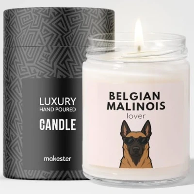 Belgian Malinois Gifts Luxury Soy Wax Candle Vanilla, Jasmine, Sugared Almond Dogs in Shades Makester