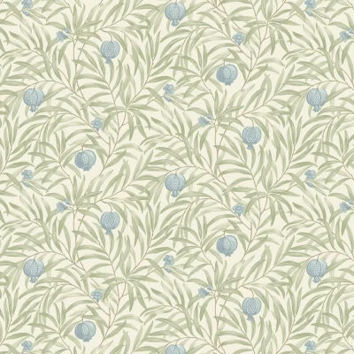 WallpaperDirectBusy trailing leaves climb this design accompanied by pomegranate fruits and flowers in contrasting colour. Seen here in the Blue colourway.