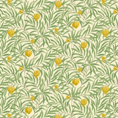 Busy trailing leaves climb this design accompanied by pomegranate fruits and flowers in contrasting colour. Seen here in the Yellow colourway.