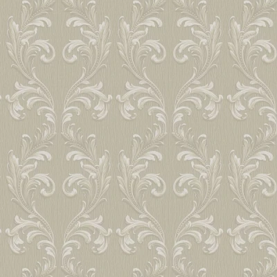 Luxurious and traditional, ornate trailing vines climb your walls with a damask-style elegance, against a wonderful faux silk textured effect. Seen here in the Beige colourway.