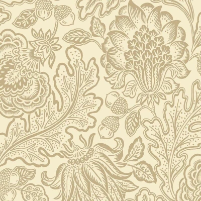 WallpaperDirectA trailing design featuring a bohemian style illustrated print with flowers, leaves and acorns with a very gentle sheen effect. Seen here in the Beige colourway.