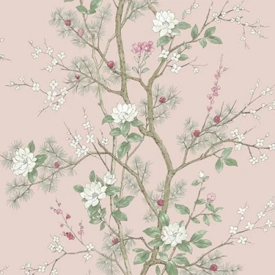 General description This captivating wallpaper features a delicate and elegant botanical pattern that brings the serene beauty of a peaceful garden into your home. The design showcases a repeated motif of graceful, winding branches adorned with beautiful blossoms and soft, thin foliage. The fine, detailed lines of the branches, combined with the soft, almost sketched look of the flowers and leaves, create a sophisticated and timeless feel that adds an air of tranquility and natural artistry to any space. The unique charm of this wallpaper lies in its stunningly romantic color scheme, with a soft, gentle blush pink background providing a luminous and inviting backdrop for the intricate design. The pattern is rendered in a gentle mix of colors, with blossoms in contrasting cream and subtle pink, and foliage in natural green, allowing the elements to stand out and create a sense of depth and peacefulness. This serene palette is both modern and classic, making it a perfect choice for