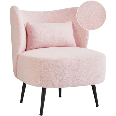 Stylish Chair with Curved Backrest. Transform your living space into a stylish relaxation or meeting space with this upholstered chair. Crafted out of durable bouclé fabric, the piece is characterised by a retro, glamorous design, and its pink upholstery goes well with many different interior decor styles. It doesn't require daily maintenance to last for many years, making it a good choice for busy households. The curved backrest and included throw pillow ensure comfort for many hours. Details: Product Type: Armchair General Color: Pink, Black Shade: Pastel Pink Material Type: Fabric Main Material: Boucle Additional Material: Plywood Filling Material: Foam Legs material: Metal Seat Material: Fabric Material Composition: 100% Polyester Arm Style: Armless Armrests: No Leg Caps/ Pads: Yes Pattern: Solid Reclining: No Seat Construction: Sinuous Springs Seat Foam Density: 25 kg/m3 Dimensions: Depth: 55 cm Seat Thickness: 21 cm Seat Height: 42 cm Width: 60 cm Height: 76 cm Seating Surface: