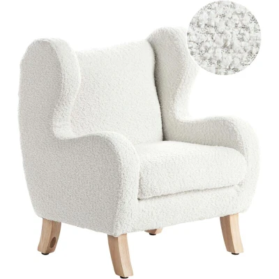Comfortable Wingback Kids Armchair. Introduce a new level of comfort into your child's life with this bouclé armchair. The soft, nubby upholstery will make your little one feel like they're sitting on a cloud, while the sturdy rubber wood legs will remain strong as your child continues to grow. Surprisingly lightweight, this armchair can be easily moved between rooms for versatile use. Its clean design offers timeless elegance that complements any decor. Details: Product Type: Kids Armchair General Color: White, Brown Shade: Off-White Material Type: Fabric Main Material: Boucle Additional Material: Rubberwood Filling Material: Foam Legs material: Wood Seat Material: Fabric Material Composition: 100% Polyester Arm Style: Recessed Armrests: Yes Leg Caps/ Pads: Yes Pattern: Solid Reclining: No Seat Construction: Plywood Seat Foam Density: 28 kg/m3 Dimensions: Armrests Height: 34 cm Depth: 41 cm Seat Thickness: 9 cm Seat Height: 29 cm Width: 45 cm Height: 55 cm Seating Surface: 32x28 cm