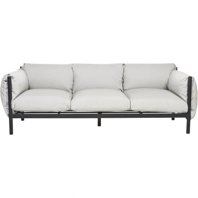 Metal Sofa with Cushions. Designed to provide ultra-comfortable outdoor lounging, this metal 3-seater sofa would be a perfect addition to any outdoor space. Its minimalistic black aluminium frame is fitted with light grey cushions that give the piece an inviting look. The cushions themselves are thickly filled with foam and wrapped in water-repellent and resistant to fading covers. This outdoor sofa can elevate any garden, styled on its own or with other pieces from the same collection. Details: Product Type: Garden Sofa General Color: Grey, Black Shade: Light Grey Material Type: Metal Main Material: Aluminium Additional Material: Fabric Material Composition: 100% Polyester Seat Foam Density: 28 kg/m3 Seats Up To: 3 People Dimensions: Armrests Height: 73 cm Depth: 96 cm Seat Thickness: 22 cm Seat Height: 47 cm Width: 211 cm Height: 80 cm Seating Surface: 185x68 cm Weight: 51 kg Weight Capacity per Person: 130 kg Offer Includes: Cushions Included, 1 x 3 Seater Sofa Key Features: Low