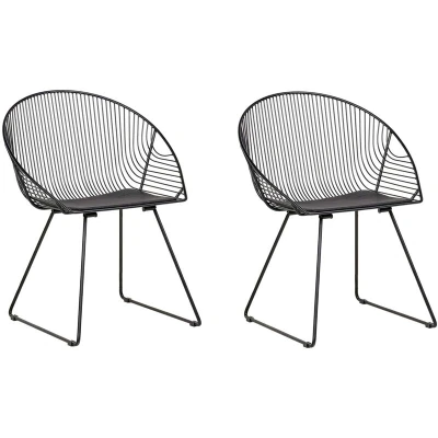 General description Pair of Dining Chairs. A statement piece for a minimalistic modern setting and a perfect addition to an industrial, Scandinavian, or vintage-inspired interior. The chair set is designed with comfort in mind - the sheltering layout of the seat has an integrated cushion covered in a soft-touch faux leather. With its open-wired construction and sled base, this chair will stand out in any bedroom, home office, or balcony. Technical specifications Product Type: Dining Chair Style: Modern General Color: Black Frame Colour: Black Main Material: Steel Additional Material: Faux Leather Legs Material: Metal Seat Material: Faux Leather Material Composition: 100% PU Leather Armrests: No Finish: Powder Coated Stackable: No Dimensions: Depth: 54 cm, Seat Height: 47 cm, Width: 65 cm, Height: 77 cm, Seating Surface: 43x56 cm Weight: 8 kg Weight Capacity: 120 kg Offer Includes: 2 x Chair, 2 x Seat Cushion Key Features: High-Quality Materials, Rust-Proof Stable Frame, Leg Caps for
