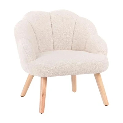 Kids Armchair with Wooden Legs. This adorable beige armchair adds a touch of charm to any child’s room. With its delightful shell-inspired design and cosy bouclé upholstery, it’s a perfect blend of style and comfort. Whether nestled in a playroom or nursery, it offers a snug spot for little ones to relax, read, or enjoy their favourite toys. Supported by durable wooden legs, this chair provides both elegance and dependable stability. Details: Product Type: Kids Armchair Style: Scandinavian General Color: Beige, Brown Shade: Light Beige Material Type: Fabric Main Material: Boucle Additional Material: Rubberwood Frame Material: Metal Legs material: Wood Seat Material: Boucle Material Composition: 100% Polyester Armrests: Yes Stackable: No Dimensions: Depth: 53 cm Seat Height: 29 cm Width: 50 cm Height: 55 cm Seating Surface: 50x42 cm Weight: 8 kg Weight Capacity: 70 kg Offer Includes: 1 x Chair Key Features: Cosy and Comfy, Stable Legs for Maximum Comfort, Designed to Complement Any