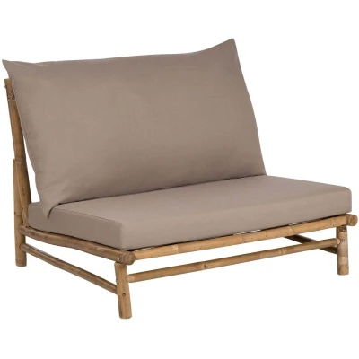 General description This low outdoor and indoor chair made from bamboo wood is an ideal relaxation spot. Its armless design features a low frame and wide seat, complemented by generously padded cushions for ultimate comfort. The natural light tone of the wood combined with taupe cushion fabric seamlessly fits into modern styles such as Japandi or Scandinavian. Technical specifications Product Type: Garden Chair Style: Rustic General Color: Brown, Beige Shade: Taupe Main Material: Bamboo Wood Additional Material: 100% Polyester Fabric Legs Material: Wood Seat Material: Wood Dimensions: Depth: 85 cm, Width: 102 cm, Height: 74 cm, Seat Height: 24 cm, Seat Thickness: 5 cm, Seating Surface: 93x52 cm Weight: 10 kg Weight Capacity: 100 kg Assembly Information: Full Assembly Required (20-40 min) Usage Suitable for both indoor and outdoor use Recommended to protect from water and rain to preserve quality UV resistant (5 ISO 105-B02) Other information Each piece may slightly vary due to the