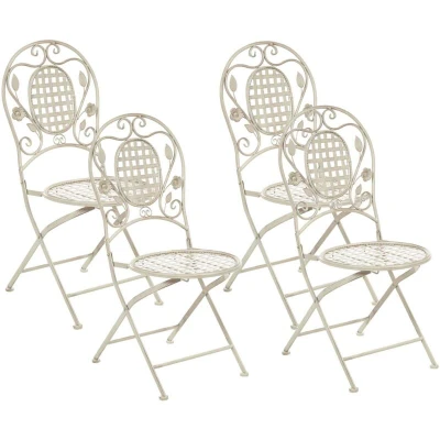 General description Add a touch of Provencal style to your balcony or garden with this elegant set of four folding garden chairs. Made from powder-coated iron, these chairs feature a distressed effect and an openwork design with floral ornaments. They are perfect for creating a cozy spot for breakfast or lunch in any outdoor setting. Technical specifications Product Type: Garden Chair Style: Retro General Color: Off-White Main Material: Iron Legs Material: Metal Seat Material: Metal Armrests: No Finish: Powder Coated Foldable: Yes Stackable: No Dimensions: Depth: 52 cm, Seat Height: 42 cm, Width: 43 cm, Height: 93 cm, Seating Surface: 40x40 cm Weight: 5 kg Weight Capacity: 120 kg Usage Chairs are foldable for easy storage during the off-season. Recommended to store under cover when not in use to ensure maximum lifespan. Regular maintenance includes keeping the item dry and cleaning with mild cleaners. For corrosion protection, avoid alkaline or acid-based cleaners and treat with a