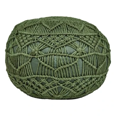 General description Add a touch of boho style to your garden or balcony with this round, hand-knitted pouffe. Crafted from a recycled PET cover, it’s both eco-friendly and stylish, perfect for laid-back lounging. Its unique pattern and design make it an inviting addition to any outdoor space. Versatile and durable, it's ideal for extra seating or as a comfy footrest. Technical specifications Product Type: Pouffe Style: Boho General Color: Green Main Material: Synthetic Material Material Composition: 100% Polyester Shape: Round Pattern: Solid Dimensions: Depth: 50 cm, Width: 50 cm, Height: 30 cm, Seating Surface: 50x50 cm Weight: 2.8 kg Weight Capacity: 80 kg Usage Ideal for extra seating or as a comfy footrest. Recommended to keep the pouffe indoors during the off-season in a dry and cool place. Clean with a mild soap-based cleaner and a soft cloth. Keep away from heat sources, such as grill or campfire areas, as fire sparks can cause major damage. Do not put any hot utensils directly