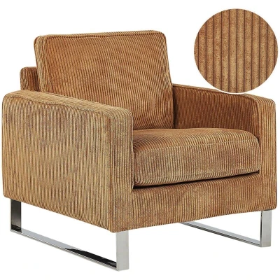Beliani Retro Living Room Corduroy Armchair Track Arms Metal Legs Light Brown Vind