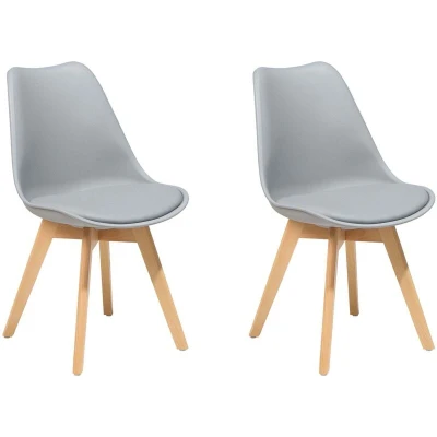 General description This functional dining chair set will refresh your dining or living space with its clean design. The ergonomically curved seat is made of hard-wearing synthetic material and is equipped with a seat pad covered in grey. Cross base legs made of beech wood complement the style and ensure total stability. The chair will be a perfect accent for Scandinavian, retro, and modern interiors. Technical specifications Product Type: Dining Chair Style: Retro General Color: Grey, Brown Frame Colour: Grey Shade: Light Grey Main Material: Synthetic Material Additional Material: Faux Leather Legs Material: Wood Seat Material: Synthetic Material Material Composition: 100% PU Leather Armrests: No Finish: Matt Stackable: No Dimensions: Depth: 43 cm, Seat Height: 48 cm, Width: 47 cm, Height: 84 cm, Seating Surface: 47x41 cm Weight: 5 kg Weight Capacity: 90 kg Installation Assembly Information: Legs to be fitted Estimated Assembly Time: 20-40 min Usage To ensure stability of the