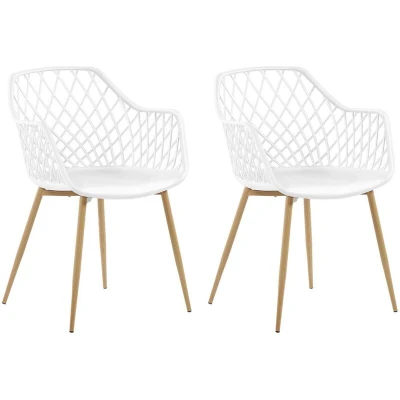 General description This set of Classic Scandinavian Dining Chairs is perfect for any kitchen or dining room inspired by Scandinavian decor. The modern net design is complemented by slender legs made from metal with a light wood finish, adding a natural accent to the overall appeal of the chairs. The seat and backrest are made from easy-care synthetic material that retains its brand-new look for a long time. Pair them with a complementary table and enjoy dining in comfort. Technical specifications Product Type: Dining Chair Style: Modern General Color: White, Brown Main Material: Synthetic Material Legs Material: Metal Seat Material: Synthetic Material Armrests: Yes Finish: Matt Stackable: No Dimensions: Armrests Height: 71 cm, Depth: 51 cm, Seat Height: 46 cm, Width: 50 cm, Height: 86 cm, Seating Surface: 44x39 cm Weight: 5 kg Weight Capacity: 150 kg Offer Includes: 2 x Chair Assembly Information: Legs to be Fitted Assembly Time: 20-40 min Installation Ensure legs are properly fitted