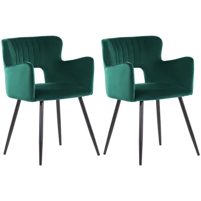 General description Set of 2 Upholstered Chairs with Armrests, featuring a modern design that combines a retro-inspired silhouette with functionality, high-quality materials, and comfort. The padded seat includes armrests and a backrest with an eye-catching cut-out detail. The smooth velvet upholstery adds depth and sheen to the olive green color, complemented by slanted, powder-coated black legs. Vertical tufting on the inner back enhances the elegant touch of these chairs, making them a perfect addition to a dining table, home office, or bedroom. Technical specifications Product Type: Dining Chair Style: Modern General Color: Green, Black Shade: Olive Green Main Material: Velvet Legs Material: Metal Material Composition: 100% Polyester Armrests: Yes Finish: Powder Coated Stackable: No Dimensions: Armrests Height: 64 cm, Depth: 44 cm, Seat Thickness: 4 cm, Seat Height: 43 cm, Width: 52 cm, Height: 75 cm, Seating Surface: 43x44 cm Weight: 6 kg Weight Capacity: 120 kg Installation
