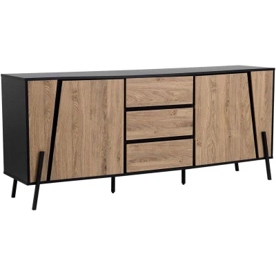 General description This modern 2 Door Sideboard BLACKPOOL in Brown and Black is inspired by Scandinavian design, making it a striking addition to any contemporary, minimalistic, or traditional living space. Its classic rectangular shape features a dark wood finish complemented by a black top and slender metal legs, giving it an industrial touch. The sideboard offers ample storage with capacious drawers and cabinets for all your accessories and essentials. Technical specifications Product Type: Sideboard Style: Rustic General Color: Brown, Black Main Material: Chipboard Additional Material: Iron Legs Material: Metal Top Material: Engineered Wood Doors Opening: Standard Number of Doors: 2 Number of Drawers: 3 Dimensions: Depth: 40 cm, Width: 177 cm, Height: 75 cm Weight: 59 kg Drawer Weight Capacity: 5 kg Shelf Weight Capacity: 10 kg Top Weight Capacity: 50 kg Installation Full assembly required Estimated assembly time: 45-60 minutes Usage Ideal for both bedroom and living room