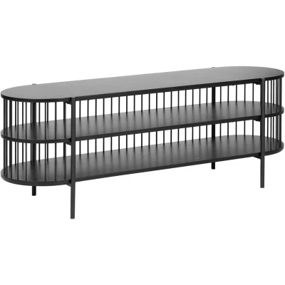 General description This stylish TV stand is designed for TVs up to 55ʺ, featuring a modern aesthetic with vertical poles at the back and sides that enhance your living room decor. It includes two practical shelves made from MDF, supported by a robust metal frame, making it perfect for storing games, remotes, and other accessories while keeping everything organized below your TV. Technical specifications Product Type: TV Stand Style: Retro General Color: Black Main Material: Engineered Wood (MDF) Additional Material: Iron Number of Shelves: 2 Drawers: No Finish: Powder Coated Dimensions: Depth: 44 cm, Width: 140 cm, Height: 50 cm Weight: 18 kg Shelf Weight Capacity: 5 kg Top Weight Capacity: 20 kg Installation Full assembly required Estimated assembly time: 20-40 minutes Usage To maintain durability, use place mats and coasters on the worktop Remove wet stains promptly to prevent damage For cleaning, use a mild cleaner and a soft cloth, then wipe dry Avoid abrasive cleaners to prevent