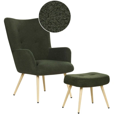 Beliani Wingback Mid Century Modern Boucle Upholstered Armchair Ottoman Set Dark Green Vejle ii