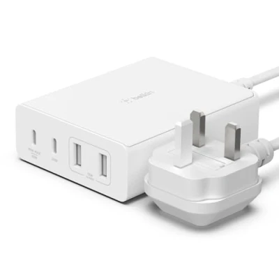 2x USB-C and 2x USB-A ports to charge up to 4 devices at 108W of total power output Integrated GaN technology provides a safe, high-powered, and efficient charge to your device while reducing the heat output, all in a compact design USB-C PD 3.0 charges a MacBook Pro from 0-50 percent in 39 mins* or charge an iPad Air 3 from 0-50 percent in 39 mins and iPhone 12 Pro from 0-50 percent in 26 mins** Intelligent Power Sharing recognizes power needs and distributes proper output to up to 4 devices Off-the-wall design allows it to live on a desk, nightstand, counter, etc. for ease of plugging-in and unplugging your devices Reaches almost anywhere with the included 2M / 6.6-foot extended length power cord Supports a wide range of devices including laptops, smartphones, tablets, power banks, and more from Samsung, Apple, Google, and other major brands Belkin is an established accessories market leader creating high quality, innovative tech solutions for over 40 years.