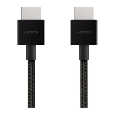 If you want to watch movies in 8K you'll need a cable that can carry the load. That's Belkin AV10176BT2M-BLK Ultra High Speed HDMI Cable. With bandwidth speeds up to 48 Gbps it is seriously fast. That means it supports 8K resolution at 60 Hz refresh rate or 4K at 120 Hz with Dolby Vision and HDR 10. This lets you watch movies and shows in striking detail, high refresh rate and vivid colour. With its durable braided exterior jacket it is also built to last. And the two-layer shielding minimizes interference, so you'll always get a clear picture.