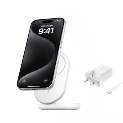 FAST CHARGE WITH THE LATEST Qi2 TECHNOLOGY: Conveniently place your phone on the magnetic charger to fast charge your iPhone or Qi2 compatible device up to 15W. With Qi2, you get up to 2x faster wireless charging* so you can spend less time waiting! PORTABLE CHARGER & FOLDING STAND: With its foldable design, this portable charger lets you easily set up shop and adjust your angle anywhere you go – get a quality charge whether you're at home, at work, or the hotel of your next vacation. PREMIUM MATERIALS: Qi2 magnetic connection easily aligns your phone, while liquid silicon rubber material provides a soft touch for its protection. Plus, a sturdy, non-slip base keeps the charger in place, and a durable hinge ensures years of use. STANDBY READY: When in stand form, the foldable magnetic charger supports StandBy for Apple users. You can mount your phone to enjoy StandBy Ready features and style your iPhone as you'd like. View the time in the office, bedroom, and more. 20W PSU & USB-C CABLE INCLUDED: This Belkin BoostCharge Magnetic Charger comes with a 20-watt power supply and 5-foot USB-C to USB-C cable, so you can begin immediately charging right out of the box without the need to make any additional purchases. CASE COMPATIBLE WITH SAFE CHARGING: Enjoy a magnetic charger that meets our Premium Safety Standard through rounds of rigorous testing. Your phone will still receive a safe charge – even when your MagSafe-compatible phone case is on (up to 3mm). SUSTAINABLY MADE WITH 2-YEAR WARRANTY: This BoostCharge wireless charger's housing is responsibly made with up to 75% post-consumer recycled content and 100% plastic-free packaging.** And maintain peace of mind with a 2-year warranty and £1,500 CEW.