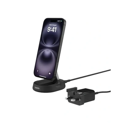 FAST CHARGE + NEW QI2 TECHNOLOGY: Conveniently place your phone on the magnetic charging pad/stand to fast charge your iPhone or Qi2 compatible device up to 15W; With Qi2, you get adaptive charging for more speed and safety features CONVERT TO CHARGING STAND OR PAD: Transform this charging pad to a stand depending on your need, having your phone upright while FaceTiming or watching videos or converting back to pad mode when you want to charge without distraction ADJUSTABLE STAND ANGLES: Support both landscape and portrait mode as you tilt your stand to your preferred angle: This BoostCharge Pro convertible charging stand supports a 0°–75° view angle and 0°–70° stand angle for easy viewing SAFE & TRAVEL FRIENDLY: Easily fold it down to pad form to keep it with you as you travel without taking up too much space in your backpack or luggage: Plus, you'll be at ease knowing your devices are protected without overcharging or draining your battery STANDBY READY: Apple users can enjoy StandBy Ready features when this magnetic charger is in stand mode. Adjust to your favorite screen and get a clear visual of the time in your office, a hotel room, or wherever you may go CASE COMPATIBLE: Ensure your phone still receives a safe charge – even when your MagSafe compatible phone case is on (NOTE: compatible with cases up to 3mm) POWER ADAPTER INCLUDED: Comes with a 20W USB-C power supply unit SUSTAINABLY MADE W/ 2-YEAR WARRANTY: This BoostCharge Pro convertible charging pad's housing is responsibly made with post-consumer recycled content, with 100% plastic-free packaging: And maintain peace of mind with a 2-year warranty and £1500 CEW