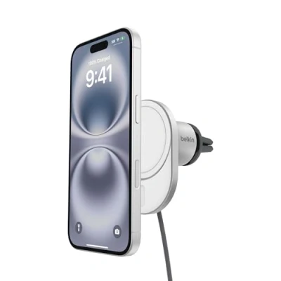 FAST CHARGE WITH Qi2 TECHNOLOGY: Conveniently place your phone on the magnetic charging mount to fast charge your iPhone or Qi2 compatible device up to 15W. With Qi2, you get up to 2x faster wireless charging* so you can spend less time waiting! SAFE MOUNTING: The powerful MagSafe module is made strong for perfect alignment and easy placement, while a high-quality base securely clips to your car vent to further help keep your phone safely mounted, regardless of road bumps and other impacts. EASY ROTATION: Position your iPhone for viewing in either portrait or landscape orientation – with portrait view being ideal for charging, listening to music, and hands-free phone calls, and landscape view ideal for using navigation apps. CONVENIENT CABLE MANAGEMENT: This magnetic vent mount car charger is designed with a convenient cable strap and rear cable holder to keep the cable within reach and free of tangling. CASE COMPATIBLE CHARGING: Enjoy a magnetic charger that provides the convenience of giving your iPhone a safe, fast charge, even when your MagSafe-compatible phone case is on (up to 3mm). SLIM PROFILE & 2-YEAR WARRANTY: The refined look includes a sleek design with slim profile for an overall elegant feel that adds style to every journey. Plus, you can maintain peace of mind with an included 2-year warranty.