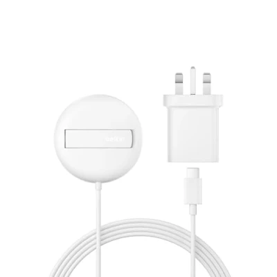 FAST CHARGE WITH THE LATEST Qi2 TECHNOLOGY: Conveniently place your phone on the magnetic charger to fast charge your iPhone, Samsung*, or Qi2 compatible device up to 15W. Qi2 gives you up to 2x faster wireless charging** so you can spend less time waiting. EASY SNAP MAGNETIC ATTACHMENT: Snap-on magnetic alignment allows you to charge your phone on this charging pad without thinking twice. A simple 'click' will assure you that your phone and the charger are properly aligned. POP-UP STAND FOR HANDS-FREE VIEWING: This magnetic charging pad features a built-in kickstand, letting you stream, video call, or use StandBy mode while your device charges. Enjoy a convenient, hands-free experience whether at home, work, or on the go. INTEGRATED 6.6ft USB-C CABLE: This Belkin BoostCharge Pro Magnetic Charging Pad has extra-long 6.6ft (2M) USB-C cable built in for extended reach. Easily plug it into a wall or power strip and reach your desk, side table, or nightstand for convenient charging. MAGSAFE COMPATIBLE FOR EASY CHARGING: Enjoy a secure, efficient charge for MagSafe devices, including iPhone, Pixel 10 and Samsung Galaxy S25, even through a MagSafe-compatible case up to 3mm thick. Simply snap on and power up hassle-free. VERSATILE, COMPACT, & TRAVEL READY: This BoostCharge Pro wireless magnetic charger doubles as a versatile charging solution for your iPhone or AirPods. Plus, a compact design makes the charger easy to take with you to work, while traveling, and more. SAFE CHARGING: The advanced protection of Belkin SmartProtect ensures the following safety features: temperature monitoring, over-voltage protection, current detection, overload protection, fire-resistant materials, and foreign object detection. SUSTAINABLY MADE WITH 2-YEAR WARRANTY: This BoostCharge Pro charging pad's housing is responsibly made with 75% post-consumer recycled content and 100% plastic-free packaging.*** Plus, you can maintain peace of mind with a 2-year warranty and £1,500 CEW.