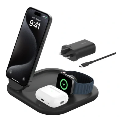Currys- Charge all your essentials in one place - this 3-in-1 charger can hold your iPhone, Apple Watch and AirPods- Qi2 technology will charge up your iPhone in no time - in fact, it's twice as quick as a 5 W Qi charger- Your iPhone's StandBy mode is supported - simply pop it on the powerful magnetic holder- It folds down flat and is powered by USB-C, so it's handy for travel
