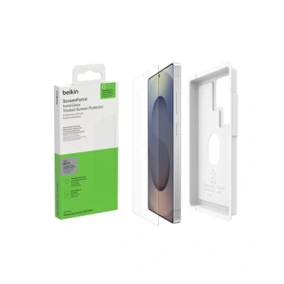 ENHANCED STRENGTH FOR SUPERIOR PROTECTION: Strengthened by ion-exchange technology, ScreenForce InvisiGlass delivers up to 62% better drop protection than standard tempered glass for increased durability against impacts, scratches, and daily wear & tear. NATIVE TOUCHSCREEN EXPERIENCE: This Samsung Galaxy screen protector's thin, smooth design provides flawless tactile response for a native touchscreen experience, ensuring the Samsung Ultrasonic Fingerprint Sensor responds without interruption. 9H HARDNESS + ULTRA-SLIM DESIGN: A 9H hardness rating offers top-tier scratch resistance for your Galaxy.With 0.33mm thickness or less, it delivers extra durability while maintaining a slim profile for an uncompromised, native screen experience. CASE COMPATIBLE + EDGE-TO-EDGE 360º SCREEN PROTECTION: Flat, full-screen coverage is easily achieved, as curved edges make this screen protector compatible with most Galaxy cases and keep your entire phone screen protected even when dropped on its edge. TREATED GLASS PROVIDES CRYSTAL CLEAR VIEWING: Treated with an anti-fingerprint and antimicrobial coating, it resists UV light, smudging, and discoloration while maintaining optimal clarity so you can clearly view photos, videos, and more. EASY ALIGN TRAY INCLUDED FOR FAST, BUBBLE-FREE APPLICATION: Applying this screen protector to your phone from the comfort of your home is made easy with the included Easy Align tray (application instructions included). SUSTAINABLY MADE: This screen protector is made with 60% recycled glass, while its packaging is made from 100% recycled plastic for sustainable, environmentally friendly packaging.* 2-YEAR WARRANTY: Our Belkin screen protectors are always built to last, with this screen cover being backed by a 2-year warranty to ensure further peace of mind.
