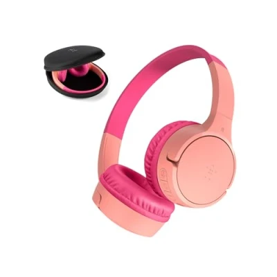 BLUETOOTH CONNECTIVITY: Easily connect to iPhone, iPad, Galaxy, and other devices with Bluetooth 5.3 pairing. Long-lasting battery allows kids to enjoy up to 30 hours of play when fully charged while maintaining their connection from up to 30 feet away. USB-C FAST CHARGING: This wireless kid's headset has a built-in USB-C port for fast charging (USB-A to USB-C cable included). Just 10 minutes of charging can provide 3 hours of playtime, so kids can enjoy less time plugged in and more time jamming out! BUILT-IN MICROPHONE & SAFE SOUND: Utilize a built-in microphone for video and phone calls. And with Belkin Signature Sound with audio tuned specifically for kids, this headphone set has an 85dB volume limiter to protect your little one's hearing. COMFORTABLE DESIGN: SoundForm Mini is cleverly crafted for a wide range of boys and girls, with an over-the-ear design and comfortable, kid-sized cushions. EASY TO USE CONTROLS: Touch controls on the headphones make it easy to play, pause, adjust volume, and pair with Bluetooth compatible devices. Plus, an optional 3.5mm aux port and included 4-foot cable allow for wired connection to your device. OOPS PROOF MATERIALS & FUN STICKERS: These kids Bluetooth headphones are durability tested to withstand 3,000 uses, surviving spills and accidents for up to 2 years. And kids can get creative and customize their headset with the included stickers! SUSTAINABLY MADE + 2-YEAR WARRANTY: This set of wireless earphones is made with 29% PCR materials and 100% plastic-free packaging to ensure eco-friendly production. Plus, a 2-year warranty allows you to purchase with peace of mind.