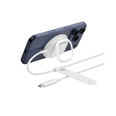 FAST CHARGE WITH THE LATEST Qi2 TECHNOLOGY: Conveniently fast charge your iPhone or Qi2 devices up to 25W on this magnetic charger. Fast charging is supported only on iOS 26 and newer, not iOS 18. MagSafe compatible for up to 5x faster wireless charging.* ULTRA-FAST CHARGING FOR YOUR IPHONE: With wireless charging now as fast as wired, this MagSafe compatible charger lets you charge iPhone from 0-50% in 29 minutes**. Plus, charge AirPods up to 5W. SNAP-ON MAGNETIC ALIGNMENT: Magnetic alignment securely snaps your phone in place for perfect, efficient, and reliable wireless charging. INTEGRATED KICKSTAND + FINGER LOOP: Enjoy hands-free streaming, video calls, or browsing with the built-in kickstand, which doubles as a finger loop to provide extra grip and security on the go, making it easier to hold and use your phone while charging. EXTRA-LONG CABLE FOR EXTENDED REACH: A built-in 6.6ft/2M tethered USB-C cable gives you the flexibility to charge and use your device comfortably from the back seat, across the couch, or at your desk without being tied to the outlet. COMPACT & TRAVEL-READY: Designed for life on the go, its slim, lightweight build slips easily into your bag, backpack, or carry-on. Perfect for travel, commuting, or everyday use, it ensures you always have a reliable charging solution wherever you go. CASE COMPATIBLE: Works with MagSafe cases up to 3mm. If your case blocks fast charging, try charging without it; if the issue is solved, switch to a MagSafe-compliant case for reliable performance. Strong magnets may also make phone removal harder. SUSTAINABLY MADE + 2-YEAR COVERAGE: This MagSafe-compatible phone charger's housing is made with recycled materials.**** And you can purchase with peace of mind, as it comes with 2-year coverage and a £ 1500 Connected Equipment Warranty.