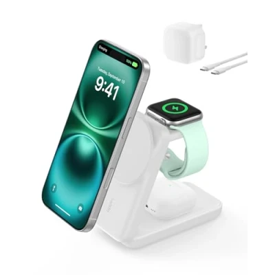 FAST CHARGE WITH THE LATEST Qi2 TECHNOLOGY: Conveniently place your phone on the magnetic charger to fast charge your iPhone or Qi2 compatible device up to 25W. Made with MagSafe compatibility, its Qi2 technology provides up to 5x faster wireless charging.* ULTRA-FAST CHARGING FOR ALL YOUR DEVICES: This MagSafe-compatible charger lets you charge an iPhone from 0-50% in 29 minutes** and Apple Watch Series 10 from 0-80% in 30 minutes.*** You can also charge AirPods up to 5W while charging your other devices. SIMULTANEOUS CHARGING, EASY ALIGNMENT: Wirelessly charge your iPhone, Apple Watch, and AirPods at the same time to quickly and conveniently prepare for your next adventure. Magnetic alignment easily snaps your phone in place for perfect charging. FOLDABLE, ADJUSTABLE, TRAVEL-READY: Folding capability makes it easy to pack and travel with, and your iPhone can still be charged even while the charger is folded. The stand angle also adjusts for landscape or portrait phone attachment up to 65 degrees. SAFE, COOL, AND SUSTAINABLE: This charger is cleverly crafted with fire-resistant, soft-touch silicone, recycled materials. Belkin SmartProtect and ChillBoost passive cooling ensure safe, efficient charging while protecting your devices and battery. STANDBY READY: 3-in-1 magnetic charger supports StandBy to style your iPhone as you'd like, allowing Apple users to mount their phone and enjoy StandBy features while working or relaxing. View the time in the office, bedroom, and more. 45W PSU CONNECTED: This Belkin UltraCharge 3-in-1 Charger comes with a 45-watt power supply and 5ft(1.5m) Type C to Type C cable, so you can begin immediately charging right out of the box without the need to make any additional purchases. CASE COMPATIBLE: Easily get the same charge to your phone without the hassle of removing your MagSafe compatible case (up to 3mm). This charger's modern design pairs with MagSafe compatibility, so your charge is not compromised by your phone case.