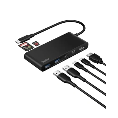 MULTIPORT USB C HUB: Expand your laptop’s capabilities with a single USB C connection. With 7 ports, you can connect an external display via HDMI and up to 6 additional devices for seamless video, data transfer, and charging. 100W POWER DELIVERY FOR YOUR DEVICES: Keep your laptop powered while staying connected to all your peripherals.* Delivers up to 100W for fast, efficient charging, powering a MacBook Pro M4, iPhone 16 Pro, and various other devices. 4K HDMI SUPPORT: This 7-port USB C hub lets you enjoy crystal clear visuals with HDMI 2.0, supporting resolutions up to 4K at 60Hz.** Perfect for extending your workspace or streaming in high definition. FAST DATA, POWER & MEDIA TRANSFERS: Transfer files, photos, and videos at up to 5Gbps while charging your host device via the USB-C port. Plus, built-in SD and microSD card readers expand storage and simplify multimedia transfers. 6-POINT SAFETY SYSTEM: Belkin’s advanced safety technology offers over-voltage, overload, overcurrent, and over-temperature protection, as well as short circuit defense and fire-resistant materials for safe and reliable use. COMPACT AND TRAVEL READY: This slim, lightweight hub is designed for portability, making it easy to slip into your bag for work, school, or travel while keeping all your connections within reach. SUSTAINABLY MADE + 2-YEAR COVERAGE: This 7-port USB C hub's housing is made with 75% PCR materials.*** And you can purchase with peace of mind, as it comes with 2-year coverage.