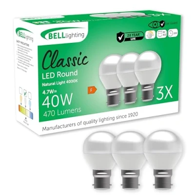 Ultra efficient BELL Lighting golf ball LED light bulbs bayonet cap featuring a natural white 4000K light output giving off 470 lumens. Using 4.7 watt of energy, this replaces a traditional lamp or incandescent light bulb, saving 88% on your electricity bill. These BELL Lighting LED bulbs have an extra long lifespan of 20,000 hours and a 2 year warranty as standard. Featuring a traditional bayonet bulb cap, these energy saving light bulbs can be used as a direct replacement for a traditional lamps or incandescent light bulbs. Boasting a high colour rendering (CRI 85+) for realistic colour representation. Featuring a smart bright opal white design, the BELL Lighting Classic LED round bulb is built on over 100 years of innovation, quality & excellence. Our lights feature eye guard, flicker free technology that provide a homely atmosphere and a safe, low glare environment integral for your comfort Perfect for home, outdoor & more. These high quality LED round light bulbs are an ideal solution for bedroom, living room, office and dining room. The durable design makes them suitable for use in IP rated external fixtures & fitting. Also ideal for commercial environments such as an office, hairdresser, retail, restaurant or hotel. Designed to be easily installed in a variety of types of applications, such as chandelier, candelabra, ceiling pendants, bedside lamps, floor lamps, wall sconces, string festoon lights & lanterns. These light bulbs are perfect for a large array of decorative lighting needs. Only suitable for dimmable fittings. This is a dimmable bulb; however, dimming performance may vary depending on the type and compatibility of the dimmer switch used. For best results, use with trailing edge LED-compatible or modern electronic dimmers. Using incompatible dimmers may cause flickering or limited dimming range., Weight: 0.110231131 Pounds, Manufacturer: BELL Lighting