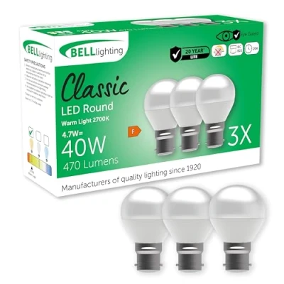 BELL Lighting B22 Bayonet Non Dimmable Light Bulb LED Golf Ball 3 Pack Warm White 2700K 470 Lumen 4.7W Energy Saving Round 40W Lamp Equivalent