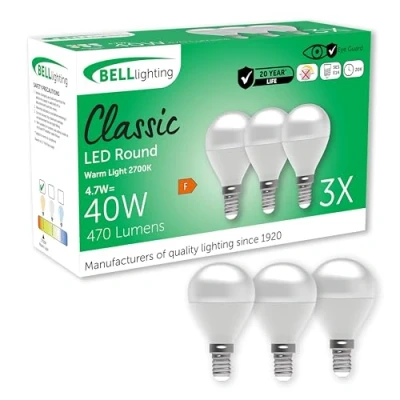 Ultra efficient BELL Lighting golf ball LED light bulbs bayonet cap featuring a warm white 2700K light output giving off 470 lumens. Using 4.7 watt of energy, this replaces a traditional lamp or incandescent light bulb, saving 88% on your electricity bill. These BELL Lighting LED bulbs have an extra long lifespan of 20,000 hours and a 2 year warranty as standard. Featuring a traditional E14 Small Edison screw cap, these energy saving light bulbs can be used as a direct replacement for a traditional lamps or incandescent light bulbs. Boasting a high colour rendering (CRI 85+) for realistic colour representation. Featuring a smart bright opal white design, the BELL Lighting Classic LED round bulb is built on over 100 years of innovation, quality & excellence. Our lights feature eye guard, flicker free technology that provide a homely atmosphere and a safe, low glare environment integral for your comfort Perfect for home, outdoor & more. These high quality LED round light bulbs are an ideal solution for bedroom, living room, office and dining room. The durable design makes them suitable for use in IP rated external fixtures & fitting. Also ideal for commercial environments such as an office, hairdresser, retail, restaurant or hotel. Designed to be easily installed in a variety of types of applications, such as chandelier, candelabra, ceiling pendants, bedside lamps, floor lamps, wall sconces, string festoon lights & lanterns. These light bulbs are perfect for a large array of decorative lighting needs. Only suitable for non-dimmable fittings., Weight: 0.22266688462 pounds, Manufacturer: BELL Lighting