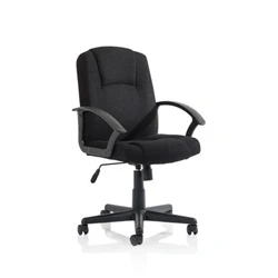 Contoured backrest and seat fabric panels. Defined shoulder and headrest support. One-touch tension adjustable tilt and lock action. Strong textured pu arms.